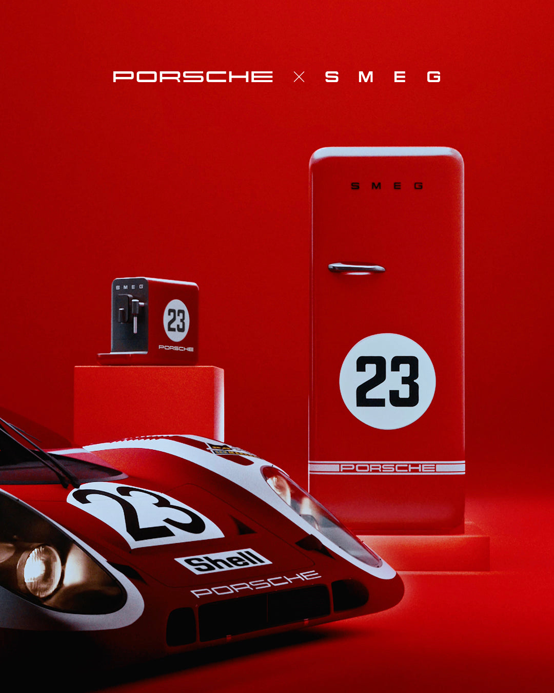 917 Salzburg Red je vjerovatno najhrabrija stvar koju su oba brenda izbacila godinama. Crvena je direktno preuzeta sa Porsche 917 KH (1970); bijele pruge i „23“ postavljeni su precizno kao na pravom trkačkom liveriju. Numerisane pločice guraju ove komade u kolekcionarsku teritoriju — ako uspiješ da ne koristiš, već samo gledaš. Fascinantno je koliko se trkačka energija dobro prevodi u frižider ili aparat za kafu — grafika pojačava već teatralan SMEG jezik. Ovo je kuhinjska oprema koja traži centar pažnje — i zaslužuje ga.